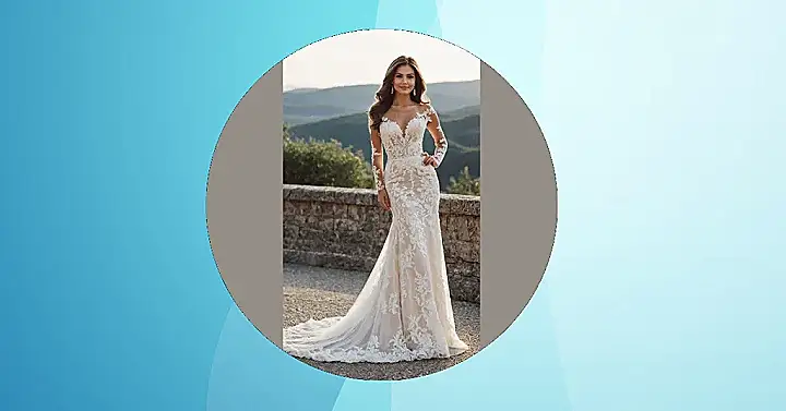 Get ready for a show-stopper, because this isn’t just any wedding dress; it’s a ‘trumpet’ dress, and it’s hitting all the right notes! Just like the musical instrument, this gown hugs tight through the bodice and hips before flaring out dramatically below the knee. It’s so sleek and shiny, you could probably see your own reflection in that gorgeous satin, ensuring every angle is Instagram-ready. And those delicate lace sleeves? They’re like the fancy flourishes on a perfectly composed melody, making sure everyone knows she’s about to conduct a symphony of style down the aisle.