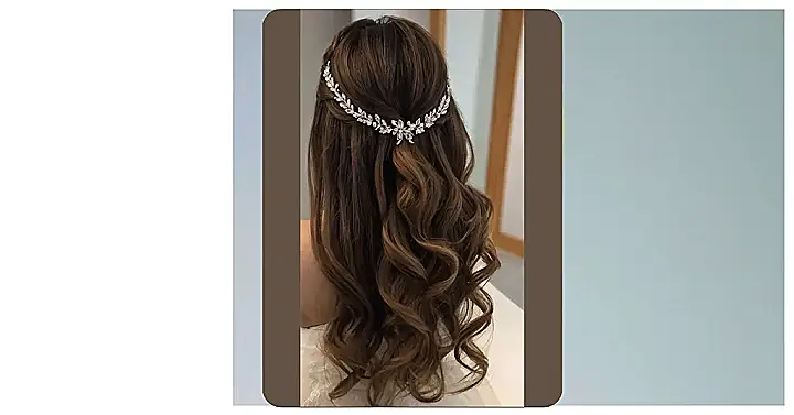 Wowza! Check out this hairstyle—it’s like something out of a fairytale! Those loose curls are totally dreamy, and that sparkly hairpiece? It’s like a crown fit for a queen (or at least a super stylish bride!). It’s elegant, it’s romantic, and it’s definitely going to make heads turn at the wedding. Forget the tiara, this is the ultimate “I Do” accessory.