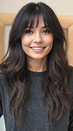What’s really cool about long hair with layers is how it magically makes styling easier. Forget wrestling with a brush trying to get some volume; these layers do that naturally, framing your face with a cool, carefree look. It’s almost like having a built-in wind machine constantly blowing a gentle breeze through your strands for that perfect movie-star effect, even when you’re just chilling in your living room. So, if you’re aiming for hair that looks effortlessly chic and makes you smile, just like the person in this photo, layers are definitely your new best friend!