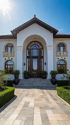This villa’s exterior is like a superhero wearing a suit – super classy but totally modern. The door is so grand, you’d expect a fancy butler to answer it and offer you a smoothie (kale and spinach, of course, because it’s a *modern* classic villa). The symmetry and those rounded windows give off serious old-school vibes, but the clean white walls and the sleek design keep it fresh. It’s the kind of place where you could throw a super chill party or just chill with your besties!