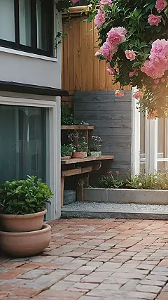This backyard is like a dreamy garden straight out of a storybook! There’s a brick pathway that looks like it leads to a hidden castle, and the flowers are so bright and colorful they make you want to wear a crown and have a tea party with the fairies. It‚Äôs the perfect spot to relax and forget about the world for a little while.