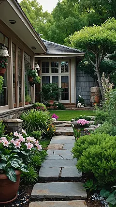 Imagine strolling through your own little Canadian paradise! This picture shows a gorgeous home garden, perfect for those lazy summer afternoons. The stone path winds its way through a vibrant mix of plants, leading you deeper into a tranquil oasis. It’s like stepping into a postcard, but better because you get to smell the flowers and maybe even spot a friendly squirrel or two hiding amongst the greenery. You could almost hear the gentle sound of a loon calling in the distance… or maybe that’s just the neighbour’s lawnmower.