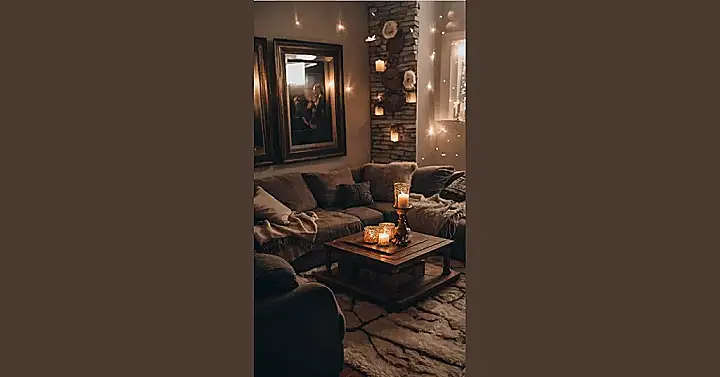Imagine snuggling up on that big, comfy couch, with the warm glow of the candles and the soft light from the fairy lights twinkling above. You’d feel like you’re in a magical, cozy escape from the cold, wintery world outside. This room is a perfect reminder that even when it’s freezing out, you can still have a warm and inviting space to relax.