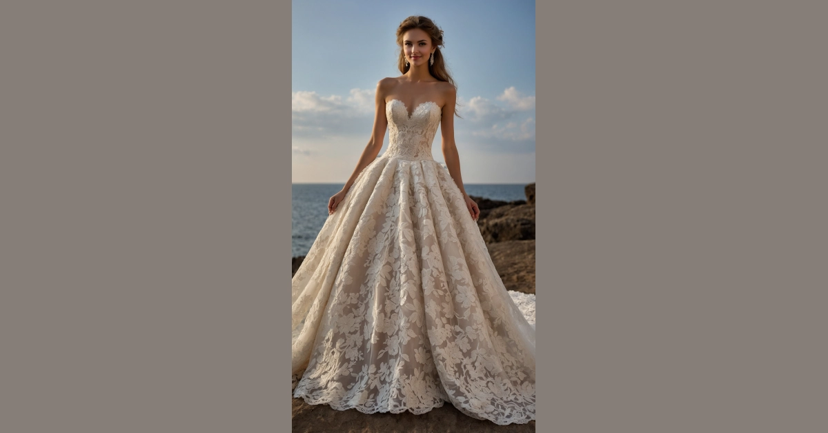 Staring at this dress, you can almost hear the wedding bells – or maybe just the sound of everyone saying “wow!” The top part with all that fancy lace is super pretty, and then check out that cool V-shaped waistline, often called a Basque waist. It’s like the dress is giving you a little hug and making you feel extra special, ready to float down the aisle feeling like royalty without all the stiff, old-fashioned stuff. Just try not to get too distracted by how awesome you look that you forget to say “I do!”