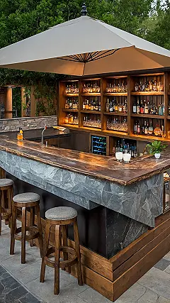 Seriously though, designing a house bar like this would make your place the go-to spot. That giant umbrella looks like it’s ready to provide shade for epic board game battles or just chilling and talking about everything and nothing. Imagine the fun of pretending you’re in some exotic resort, just steps from your back door. It’s way better than doing chores, right? This bar isn’t just furniture; it’s the beginning of countless fun memories and possibly the source of the world’s best juice blends.