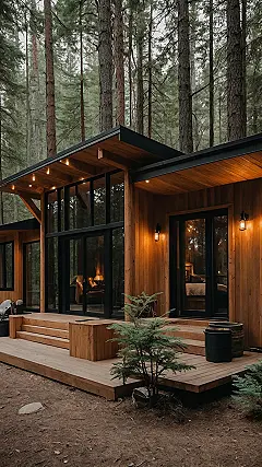 Stepping inside this place would probably feel like walking into your favorite comfy hoodie, but way fancier. Out front, you’ve got those perfect little steps inviting you in, and even a neat stack of firewood just begging for a s’mores night. The warm glow from inside suggests a serious upgrade from roughing it; maybe a heated floor, or at least enough outlets for all your chargers. It’s a place where you could totally impress your friends with a ‘wilderness’ adventure that still includes a spotless kitchen and probably a fancy coffee maker. Forget surviving in the wild; here, you’re thriving in modern comfort while still getting those epic forest views.