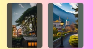Imagine you’re floating in a hot air balloon, gently drifting over a place that feels like it’s straight out of a fairy tale. You’re looking down at a town nestled on top of a rocky mountain, with houses that look like they were built by gnomes. The sun is setting, painting the sky in a beautiful blend of pink and orange, making it look like a giant, magical sunset painting.