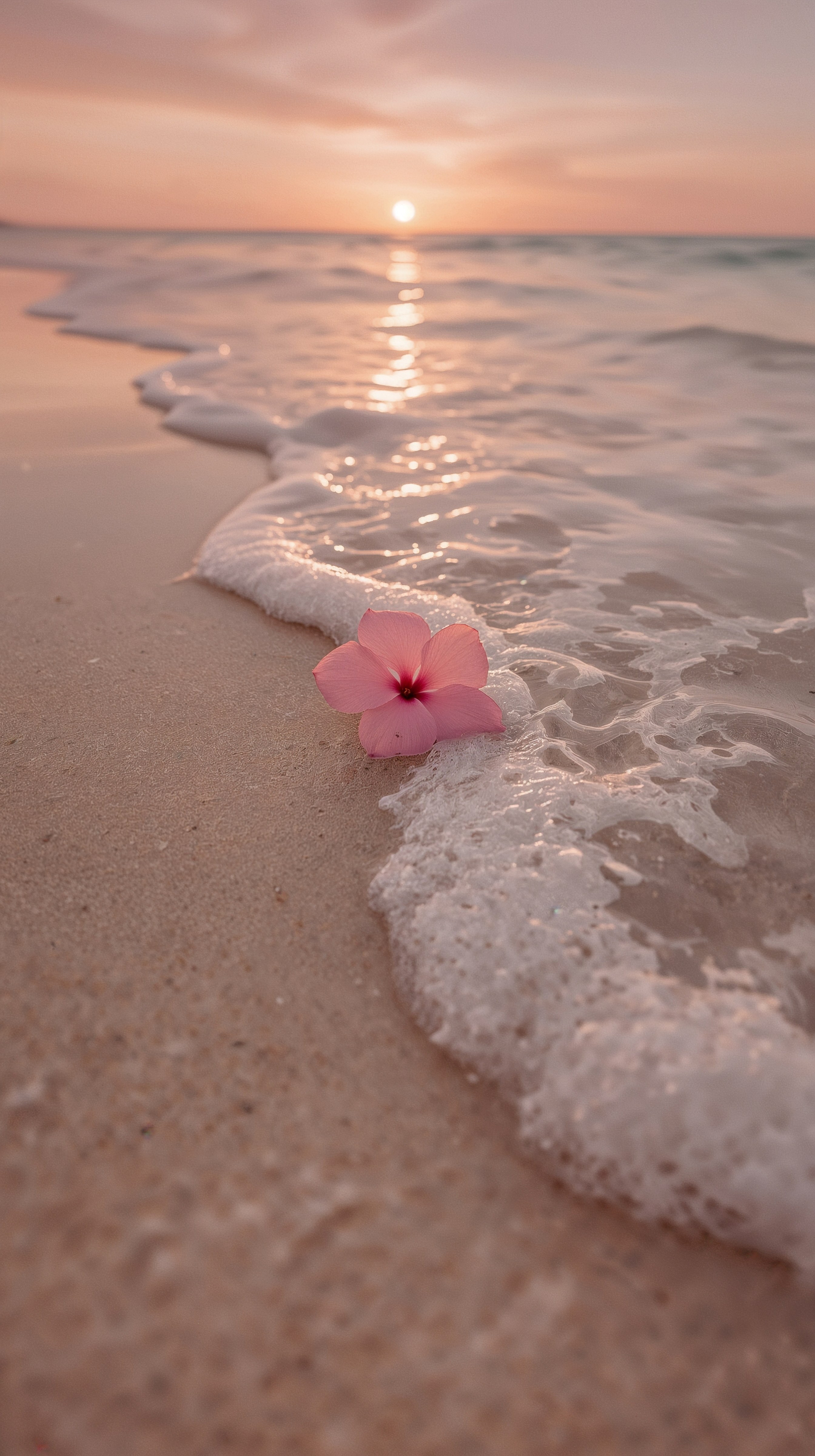 Experience tranquil beauty with this aesthetic beach flower wallpaper, showcasing a delicate pink bloom against golden sand as sunset waves gently roll in. The warm blush tones evoke coastal room decor energy and ocean wallpaper charm.