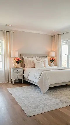 This room is like something out of a magazine! It’s so bright and airy with all those big windows letting in the sunshine. Imagine waking up in this cozy bedroom and seeing the light stream in, it’s like a warm hug from the sun! The wooden floors are perfect for walking around barefoot and the fluffy rug adds a touch of softness. That big comfy bed looks like the perfect spot for relaxing after a long day, especially with those cute pillows.