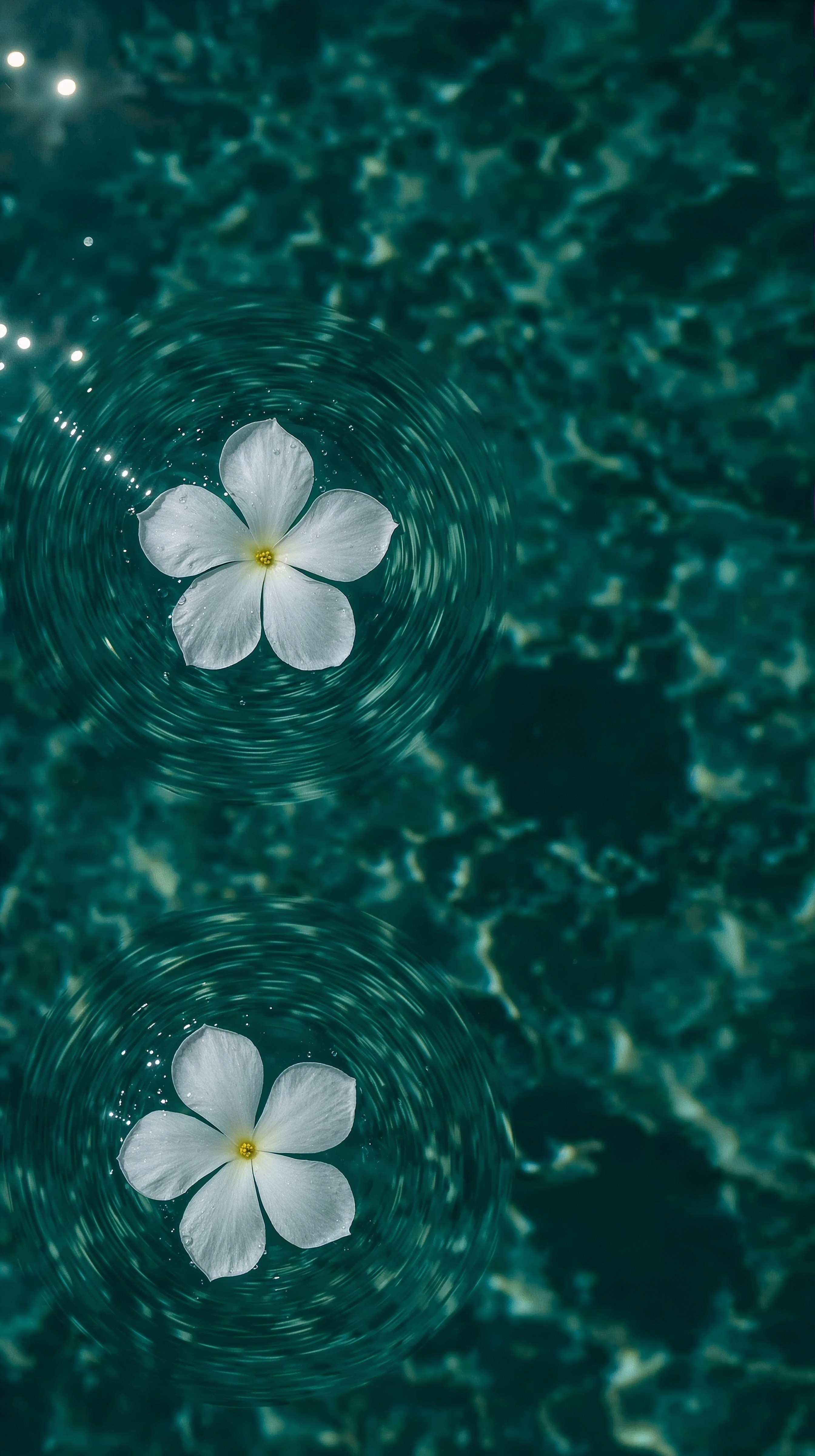 Experience the serene beauty of aesthetic summer pictures with this minimalist wallpaper, showcasing two delicate white blooms floating on deep teal water. It offers a feminine iPhone wallpaper sensibility that is both understated and richly evocative.