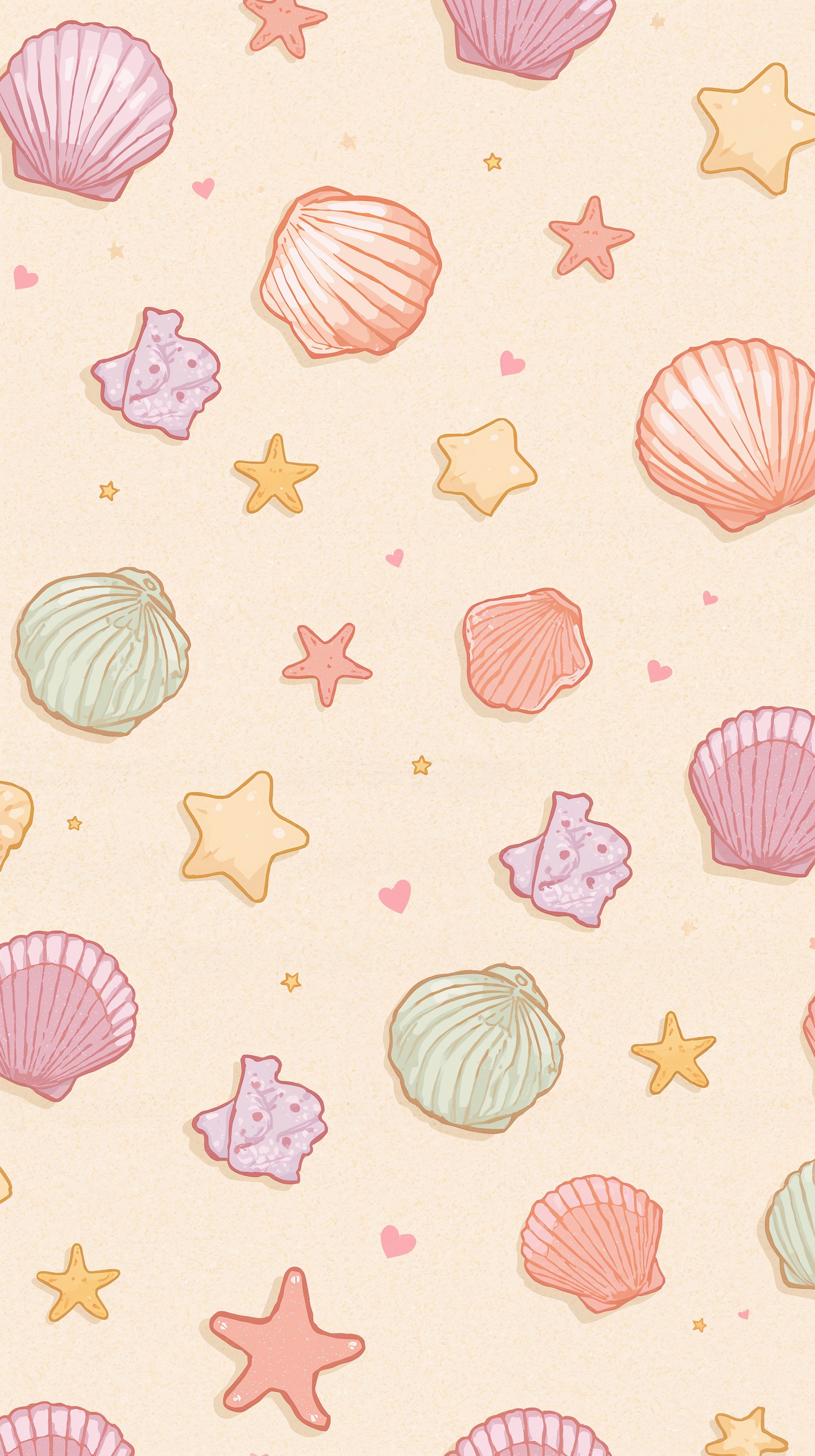 Bring the charm of a day at the shore to your phone with this cute sea wallpaper aesthetic, featuring pastel cartoon seashells and cheerful starfish scattered on soft pink sand. The playful, preppy vibe is enhanced by blush tones mixed with lavender and baby blue accents.