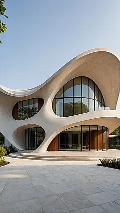 Look at this architectural marvel! It’s like the architect challenged themselves to build an entire house without drawing a single straight line, and then totally aced it. Forget boring boxes; this ‘Curved Modern Architecture’ gem looks less like a building and more like a giant, super-smooth sculpture that somehow sprouted windows and palm trees. You’d half expect to see a superhero fly out of one of those perfectly round windows, or maybe a giant scoop of melted vanilla ice cream gently sliding down the side. Good luck trying to hang a poster straight on these walls!