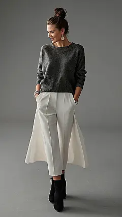 **Paragraph 1:** Okay, so fall brunch is calling, and you want to look fab but not *too* try-hard, right? This outfit is your secret weapon. Imagine this: You’re strolling into that cute café, all cozy in your grey sweater – think ultimate comfort vibes. But then BAM! – those chic white pants and that flowy, almost-a-skirt, almost-not-a-skirt thing totally elevates the look. It’s like comfy meets chic in the most perfect fall way. Plus, those ankle boots? They’re practical AND stylish – ideal for navigating crunchy leaves after your pumpkin spice latte.