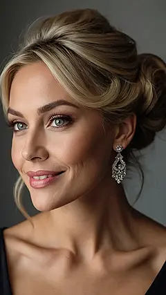The woman in the picture looks absolutely stunning! Her hair is pulled back in a classy up-do, making her look like she’s ready for a night out, not a night in with the kids. And those earrings? They sparkle like she just walked out of a fairytale! Maybe she’s going to a fancy wedding or a special event. Whatever it is, she’s looking fierce and totally ready to take on the world.