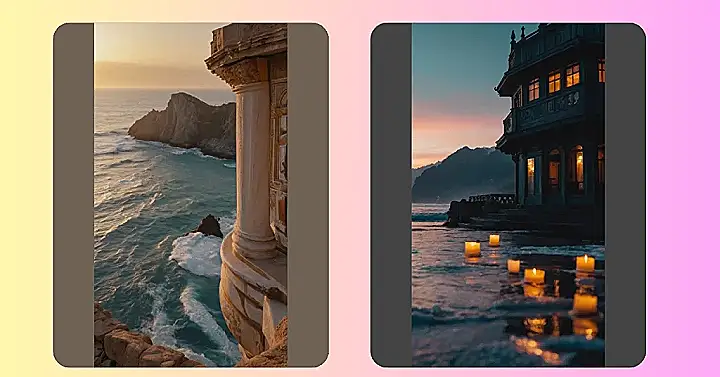 The image shows a beautiful old house, with windows glowing like warm, inviting eyes. It’s perched right on the edge of the ocean, like it’s ready to take a dip! The water laps gently against the shore, and the sky is painted with soft colors of pink and orange. The whole scene is so peaceful, you could almost hear the waves whispering secrets about lost treasures and faraway lands.
