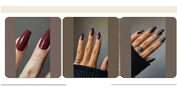 Those long, pointy nails are rocking a stunning maroon gel polish. It’s like the perfect shade for someone who wants to stand out but still be a little mysterious, you know? Like a vampire who loves to wear fancy clothes but also really loves pumpkin spice lattes.