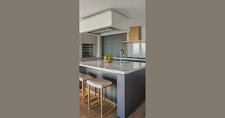 This kitchen is so fancy, it makes my own look like a dusty old shed. Just imagine: you’re whipping up a delicious meal, and you have the perfect view of your gorgeous marble countertops. The grey cabinets and sleek appliances are a chef’s dream, and you can almost feel the cool, smooth surface of the island counter under your fingertips. This kitchen is like a magazine spread come to life, and I’m already dreaming of making my own kitchen look this amazing!