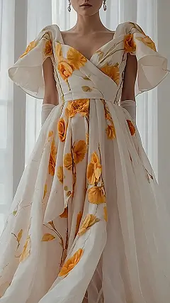 This dress is like a field of flowers exploded all over a beautiful, flowing gown! It’s got a super cute, vintage vibe with the puffy sleeves and the flowy skirt, and the yellow flowers make it feel like you’re stepping out of a painting. Imagine twirling around in this beauty at a summer picnic or maybe even a fancy garden party. You’d definitely be the prettiest flower in the whole garden!