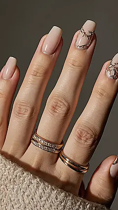 Wow, check out these nails! If your fingers could get dressed up for a fancy May event, this is pretty much peak style. These aren’t just plain nails; they’re rocking some seriously cool gold designs that look like they climbed right off a fancy piece of jewelry, complete with tiny sparkles. Add those sparkly and sleek rings, and your hand is basically ready for a magazine cover or at least ready to hold your phone looking incredibly glamorous while you scroll through TikTok.
