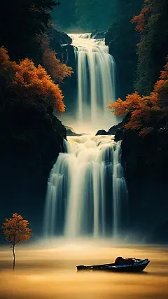This picture is like a scene straight out of a fairytale! Imagine waking up to this view – a majestic waterfall cascading down mossy rocks, surrounded by beautiful trees with leaves turning a gorgeous shade of orange. It’s so peaceful, it’s almost like the world is holding its breath!