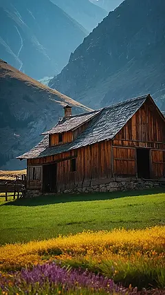 This picture is like a scene straight out of a fairytale! A cozy little wooden cabin sits tucked away in a valley surrounded by rolling green hills and majestic mountains that almost touch the sky. It’s like the cabin is whispering secrets to the mountains, and the mountains are whispering back with the gentle breeze.