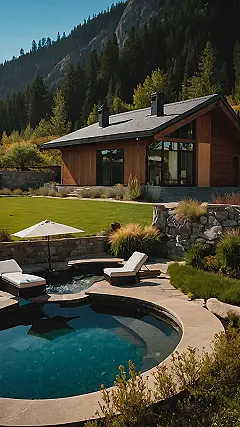 This house is seriously gorgeous! It’s like a dream come true, nestled right up against a mountain with a view that would make any Instagram influencer jealous. They even have a swimming pool! I bet it’s perfect for those hot summer days, especially since there are comfy lounge chairs for chilling out. I’m pretty sure I’d spend all day in that pool if I lived here.