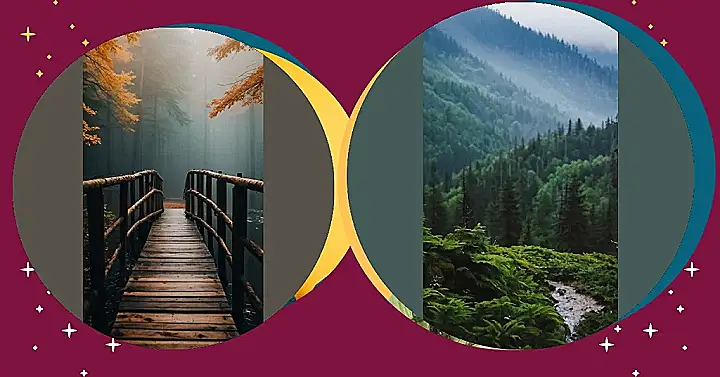 The image shows a wooden bridge, the kind you’d find in a fairytale, leading into a mysterious forest. It’s like walking into a painting, with the trees blurring into the foggy background. The only sounds you’d hear are the crunch of leaves under your feet and maybe the rustling of a squirrel hiding in the branches.