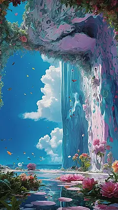 Check out this awesome picture that looks like a giant waterfall decided to ditch the whole “water” thing and just become a cascade of melted candy colours instead! Seriously, it’s so artistic it probably has its own beret and tiny easel. You’ve got random floating things that look like they’re late for a party, sparkly water reflecting the weirdness, and flowers that seem way too happy about the whole situation. It’s the kind of scene that makes you wonder if the artist was painting with their eyes closed and got lucky.