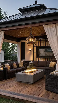 Thinking your deck is just a place where spiders plot their next web takeover and old patio chairs gather dust? Look at this picture! It’s like a secret level unlocked for hanging out. Imagine having a setup like this – comfy couches that don’t give you weird back pain, a fire pit thingy that looks straight out of a movie, and cool lights hanging overhead. This isn’t just a deck; it’s the ultimate chill zone upgrade, perfect for ditching boring inside spots and having legendary talks under the almost-stars, maybe with some questionable snacks involved.