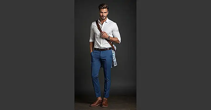 This guy in the photo totally gets the smart casual mission. He looks put-together, but not like he’s heading to a fancy ball. It’s the ultimate move for when you want to look good without feeling stiff, like your shirt is whispering “I’m important,” but your pants are shouting “but I can still eat pizza!” That crisp white shirt with the blue pants and cool brown shoes? It’s basically the uniform for looking effortlessly cool at anything that isn’t school or a formal wedding. Plus, that jacket slung over the shoulder just adds a touch of “I’m too cool for this weather… maybe.”
