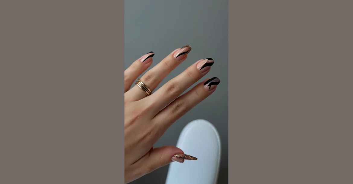 Hey there, future nail artists! Check out these super-stylish nails – they’re like a minimalist masterpiece, but way more fun. Imagine a super-chic beige base, then BAM! Swanky black stripes and a tiny sprinkle of glittery gold. It’s like modern art, but for your fingertips. You could totally rock these to school, a party, or even just chilling with your friends. No need for crazy complicated designs; less is definitely more when it comes to these trendy nails! They’re stylish, sophisticated, and totally Instagram-worthy.
