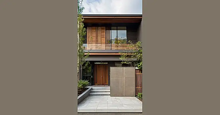 Can we talk about that door? It’s like a secret portal to a world of luxury. Plus, it’s got those stylish wooden slats on the side that are like sunglasses for the house – keeping things cool and mysterious! I bet whoever lives there has a super-secret hideout where they plot world domination…or maybe just play video games in peace.