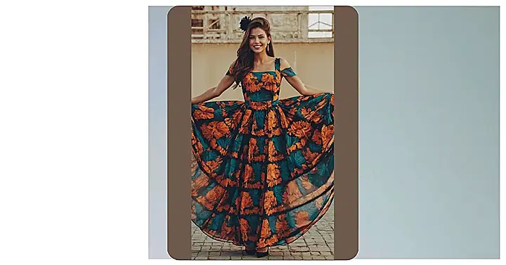 Whoa, check out this dress! It’s like a whole garden decided to have a party and got invited onto this outfit. The way it flows out makes you just want to spin around until you get dizzy. Seriously, you’d have to be made of stone to resist the urge to do a little twirl when you’re wearing something this vibrant and alive. Plus, the flower in the hair? That’s just adding extra points to the “ready to have fun” meter.