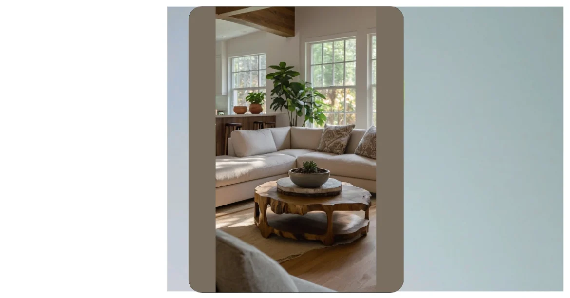 Seriously, that chunky coffee table made of wood is a masterpiece! It’s like a giant, super stylish tree stump, but way more comfortable to rest your snacks on. And check out that plant – it’s like the living room’s own little, stylish jungle guardian. The whole room is totally organic, meaning it uses natural materials, but it’s also super modern, making it totally awesome. Who needs a trip to the forest when you can have this amazing space at home?