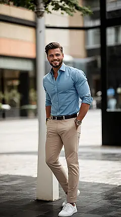 That’s one fresh look! This dude’s got the whole “cool but classy” vibe down with his white shirt and those snazzy blue pants. Rolling up the sleeves is a power move, showing that he’s ready for anything, whether it’s crushing a presentation or grabbing some pizza with friends.