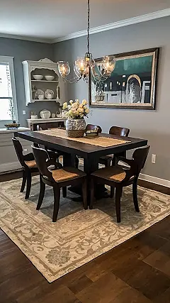 This room is all about balance. The dark table and chairs are grounded by the light rug and walls, and that cool chandelier adds a touch of sparkle without being too over-the-top. Plus, that built-in cabinet is just begging for you to fill it with all your favorite dishes (and maybe some emergency snacks). So, ditch the takeout containers and get decorating; dinner is about to get a whole lot fancier!