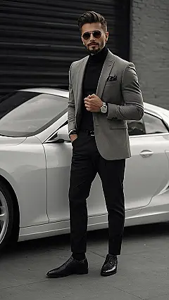 Alright, so you want to look like you own the place, even if the only thing you own is a killer playlist? Check out this dude. He’s rocking that whole “sophisticated secret agent who also enjoys poetry” vibe. Notice the blazer isn’t trying too hard, but it’s definitely making a statement. Plus, the turtleneck? Smooth. It’s like saying, “Yeah, I’m important, but I’m also comfortable enough to eat spaghetti without stressing.”