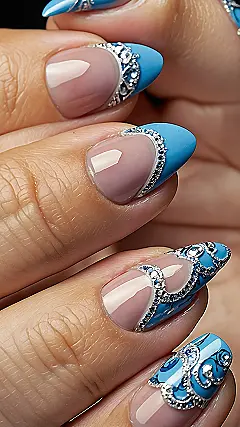 Blue nails aren’t just a color; they’re a mood booster, especially when they look this fancy! Forget about feeling down because these fingertips are rocking shades of sky blue and icy designs that are anything but gloomy. With intricate silver swirls that look like tiny vines climbing across your nails and little sparkly gems catching the light, you might feel like your hands belong to royalty or a fairy princess. Seriously, with nails this glamorous, your biggest worry becomes how to avoid doing anything that might mess them up, like, you know, everything you usually do with your hands. Maybe they should just stay perfectly still and admired!