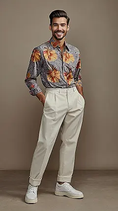 This guy’s outfit is seriously flower power, but make it fashion! He’s rocking a bold print shirt – think big, beautiful blooms – that’s anything but your grandma’s curtains. It’s got a cool, kinda artsy vibe that’s totally unexpected with the crisp white pants, making the whole look super stylish and fresh. Who needs a boring outfit when you can make a statement with some seriously awesome prints?