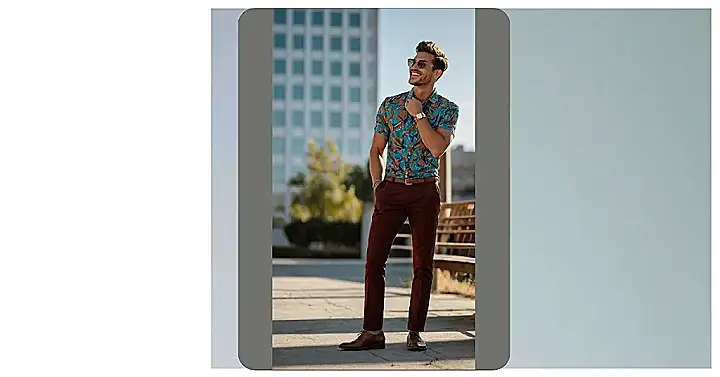 Seriously though, that shirt is bursting with colour! It’s the kind of bold print that makes a statement without even trying. He’s totally nailed the “mens bold print shirt outfit” thing. The great thing is, this look is super versatile – switch out the white pants for jeans, shorts, or even something darker, and you’ve got a completely different vibe going on. Think of all the possibilities! So if you’re looking for a way to add some pizzazz to your wardrobe, a bold print shirt might be just the thing you need to brighten up your day!