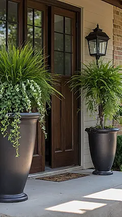 Think of these front porch planters as your house’s accessory game level-up. The plants inside, like the tall spiky one and the fluffy fern chilling in the photo, are like tiny green celebrities throwing a party right outside your door. Sure, keeping them alive might feel like a mini-quest sometimes, but when they’re looking this good, totally worth it! They add color, texture, and basically make your porch scream ‘Welcome!’ (but in a cool, leafy way). It’s a simple way to make your entrance feel like the coolest spot on the block.