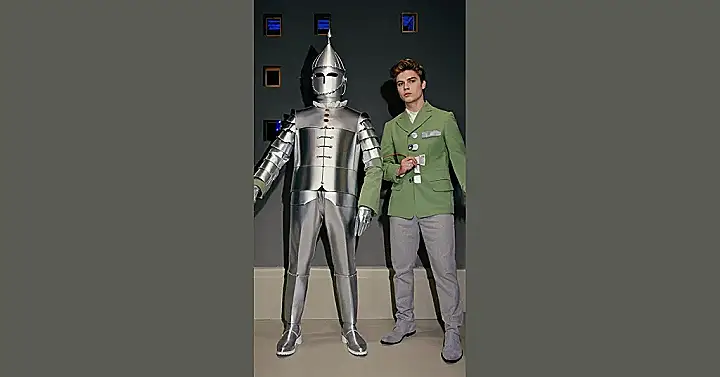 But hey, at least the Tin Man is looking pretty dapper in his silver suit and boots! I bet he’s ready to head off to the Emerald City with Dorothy and the gang. I wonder if he’s still looking for a heart, though. Maybe the guy in green can help him out – he’s got a heart on his jacket! Who knew finding a heart could be so stylish?
