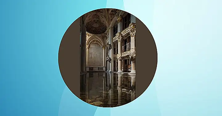 This picture shows a grand hall built in the baroque style, which means it’s super fancy and full of fancy stuff like columns and curved ceilings. It’s so fancy, you might even think it’s a palace! But something’s a little off… The floor is flooded, and all those fancy pillars are reflecting in the water. It looks like someone turned on the sprinklers in this historical building!