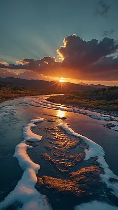 Wow, just look at this picture! It’s like someone painted a postcard, but way cooler. We’ve got this amazing sunset, painting the clouds in fiery oranges and purples. The river winds its way through the landscape like a sparkly, golden ribbon, and those little patches of white look like someone spilled a giant tub of cotton candy! This totally fits the “pretty landscapes photography” thing; it’s almost too beautiful to be real! I bet taking this photo was a total adventure, maybe even involving a comfy chair and some hot cocoa at the end.