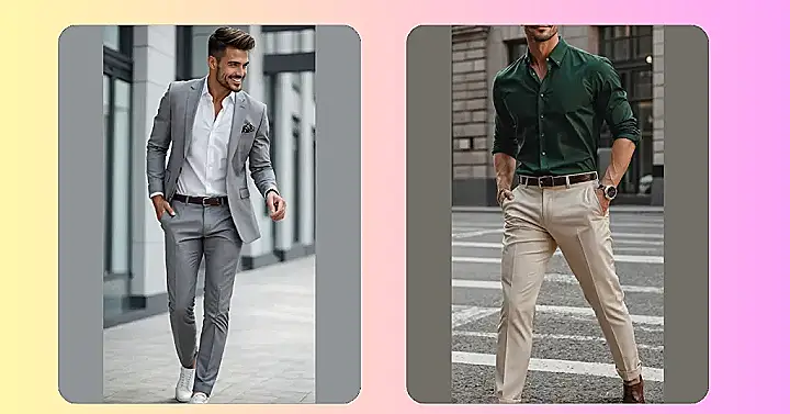 Dressing fancy doesn’t have to feel like wearing a cardboard box, and this guy in the picture totally gets it! He’s rocking a cool blue shirt tucked into sharp grey pants with a nice belt, looking super put-together but also comfy enough to actually smile. It’s like his clothes are saying, “Yeah, I clean up nice, but I’m still pretty chill.” So next time you need to look sharp for something important, remember you can nail that formal vibe without feeling like you’re heading to a job interview from the 1800s. Just grab some decent pants and a shirt that fits well, and bam – you’re halfway to looking like a style pro!