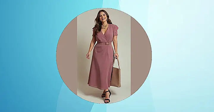 The image shows a super-stylish woman rocking a stunning plus size dress. She looks confident, happy, and ready to take on the world, proving that looking good and feeling great isn’t limited to any size! The dress is perfect for any occasion, from a casual lunch with friends to a fancy dinner date. The color is gorgeous, and the wrap style is super flattering. It’s like the dress was designed to highlight all the amazing things about her figure.