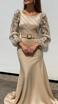 This dress is so fancy, it practically screams “red carpet” even if you’re just walking into your local pizza place. It’s like the dress version of showing up in a limo – guaranteed to turn heads, but maybe a little *too* extra for a casual Tuesday. Those lace sleeves are straight out of a fairy tale, and the belt gives it that snatched-waist vibe that everyone’s after.