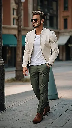 This guy is definitely rocking the winter fashion scene! He’s got the perfect combination of warmth and style, with his creamy jacket keeping him cozy while his green pants and sleek shoes add a touch of class. It’s like he’s saying, “I’m ready for whatever the weather throws at me, and I’m gonna look good doing it!” And let’s not forget those stylish sunglasses – they add a bit of mystery and intrigue, like he’s got a secret mission to stay warm and fashionable.