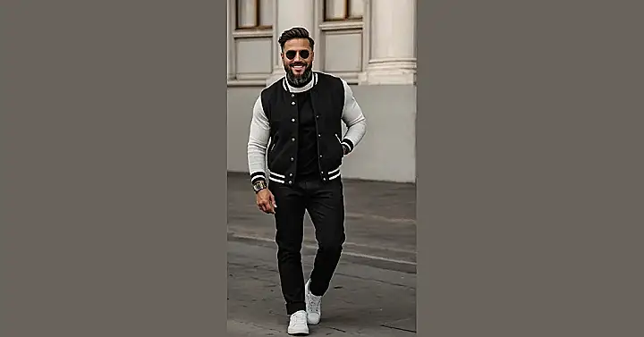 This guy is rocking the classic varsity jacket! It’s like a super cool, sporty vibe that you can totally pull off. Those black pants and white sneakers are the perfect match, making his whole outfit super sharp. Imagine walking down the halls at school in this, maybe with a stylish backpack? You’d be turning heads for sure!