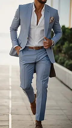 This guy is totally rocking the “mens formal outfits” look! He’s got a light blue suit that looks sharp and stylish, and a crisp white shirt that makes him look like he’s ready for anything. Plus, the brown leather belt and shoes add a touch of sophistication. You can tell he’s not afraid to stand out in a crowd. He’s like a walking advertisement for all the good things about wearing a suit!